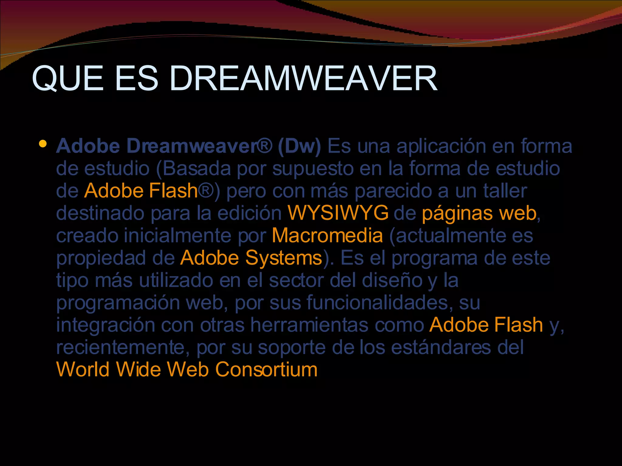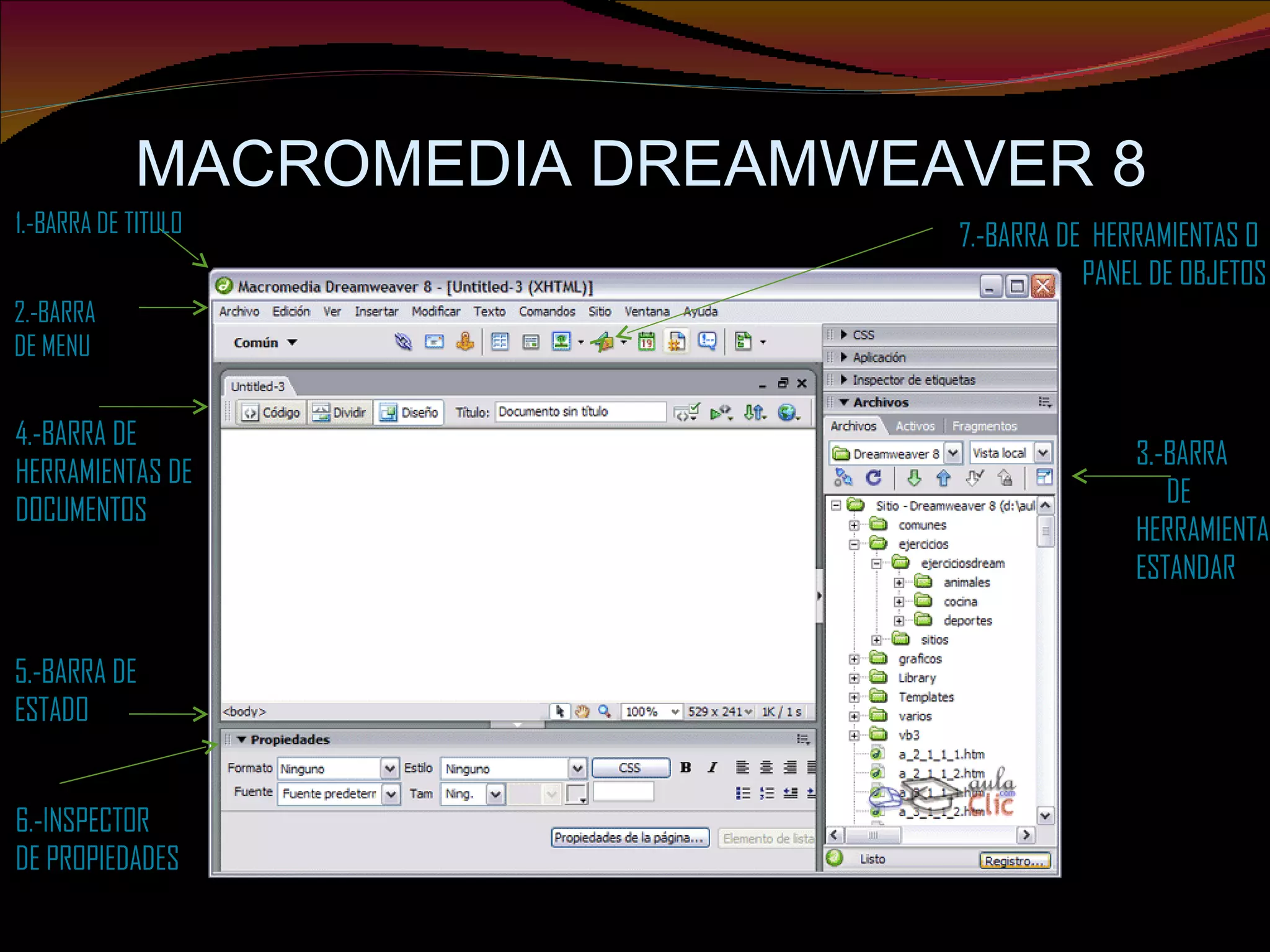 Este documento proporciona una introducción a las principales características de la interfaz de usuario de Adobe Dreamweaver. Describe las 7 secciones principales de la interfaz: 1) la barra de título, 2) el menú, 3) la barra de herramientas estándar, 4) la barra de herramientas de documentos, 5) la barra de estado, 6) los paneles e inspectores como el Inspector de Propiedades, y 7) la barra de herramientas Insertar o panel de objetos. El documento explica brevemente el propósito de cada
