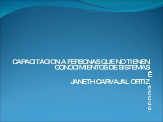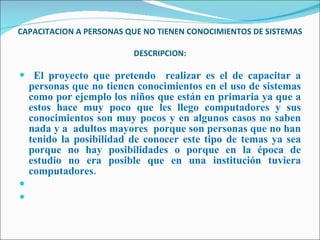 Este documento describe un proyecto para capacitar a personas sin conocimientos de sistemas, como niños de primaria y adultos mayores, en el uso de herramientas informáticas y Internet. El objetivo es enseñarles a usar aplicaciones de office, crear cuentas de correo, buscar información en línea y aplicar estos conocimientos en su vida diaria. La capacitación se llevará a cabo en el CACNET de una institución en el departamento de Cauca, Colombia, utilizando tableros, diapositivas y carteleras