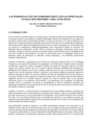 Este documento describe la evolución histórica del concepto de educación especial. Comienza con los primeros intentos de atención a personas con deficiencias en la Antigüedad y la Edad Media. En los siglos XV-XVIII se iniciaron los primeros esfuerzos educativos para sordos, ciegos y deficientes mentales. En el siglo XIX surgió la colaboración médico-pedagógica y la identificación de diferentes tipos de deficiencias. Finalmente, el concepto ha evolucionado hasta referirse a "alumnos con