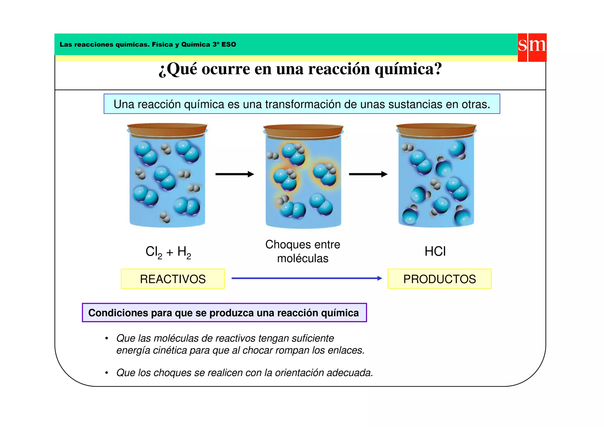 Una reacción química transforma reactivos en productos cuando las moléculas de los reactivos chocan y rompen sus enlaces bajo condiciones adecuadas. Las moléculas deben tener suficiente energía cinética para romper los enlaces al chocar y los choques deben producirse con la orientación correcta para que ocurra la reacción.