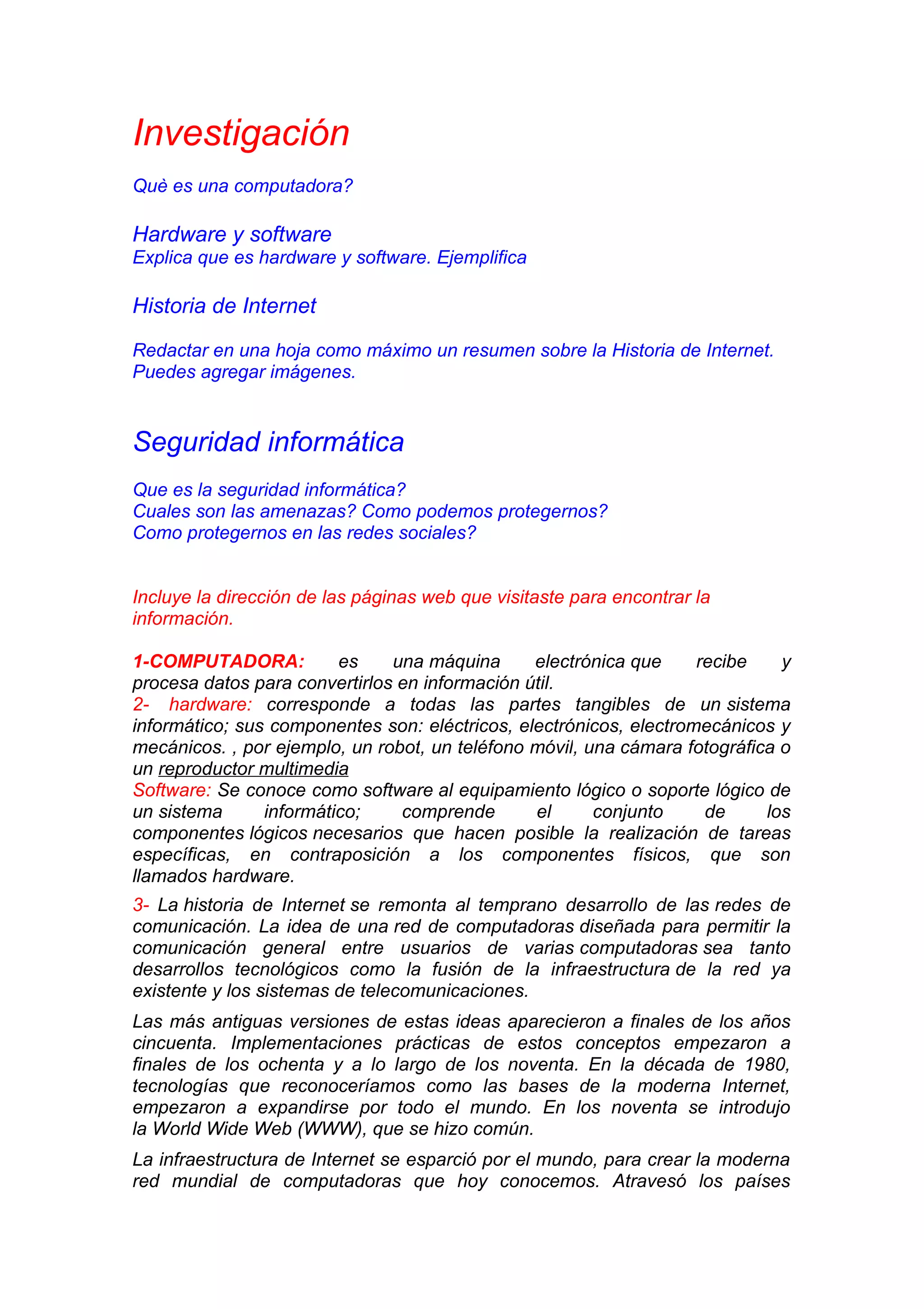 El documento trata sobre varios temas relacionados con la informática. Explica brevemente qué es una computadora, hardware y software, e incluye un resumen de 3 oraciones sobre la historia de Internet, describiendo los orígenes de las redes de comunicación y el desarrollo e implementación práctica de los conceptos de red a finales de los 80 y 90. También define la seguridad informática y menciona algunas amenazas y formas de protección, especialmente en redes sociales. Incluye direcciones de páginas web consultadas para la información.