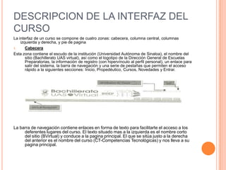 Este documento describe la interfaz de un curso en la plataforma virtual de la Universidad Autónoma de Sinaloa. La interfaz incluye una cabecera, columna central, columnas laterales y pie de página. La columna central contiene enlaces a recursos y actividades del curso. Los cursos están organizados en bloques semanales que incluyen objetivos, temas, actividades y rubricas de evaluación.