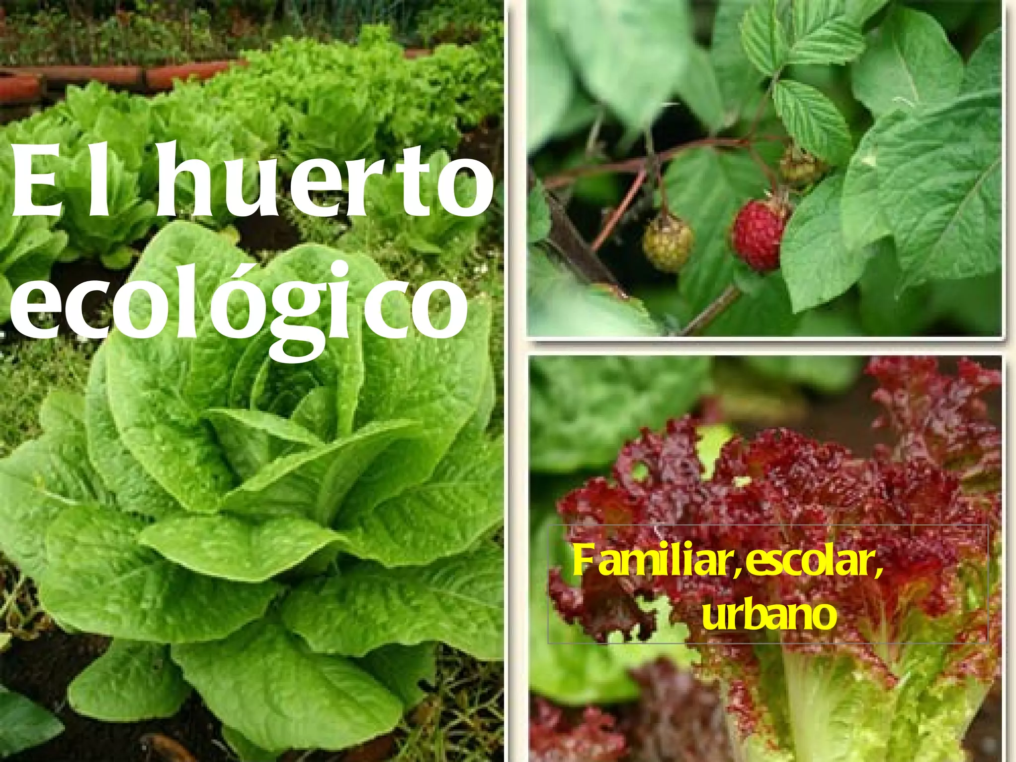 El documento habla sobre un huerto ecológico que puede ser familiar, escolar u urbano.
