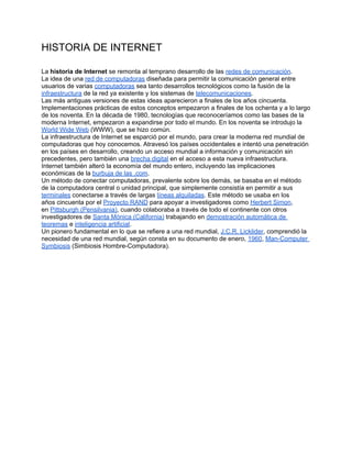 El documento describe la historia de Internet. Se remonta a las primeras redes de comunicación y la idea de una red de computadoras que permitiera la comunicación entre usuarios de diferentes máquinas. En la década de 1980 se empezaron a expandir tecnologías que serían la base de Internet moderna. En los 90 se introdujo la World Wide Web, que se hizo popular. Internet se extendió por el mundo, creando una red global de acceso a información sin precedentes.
