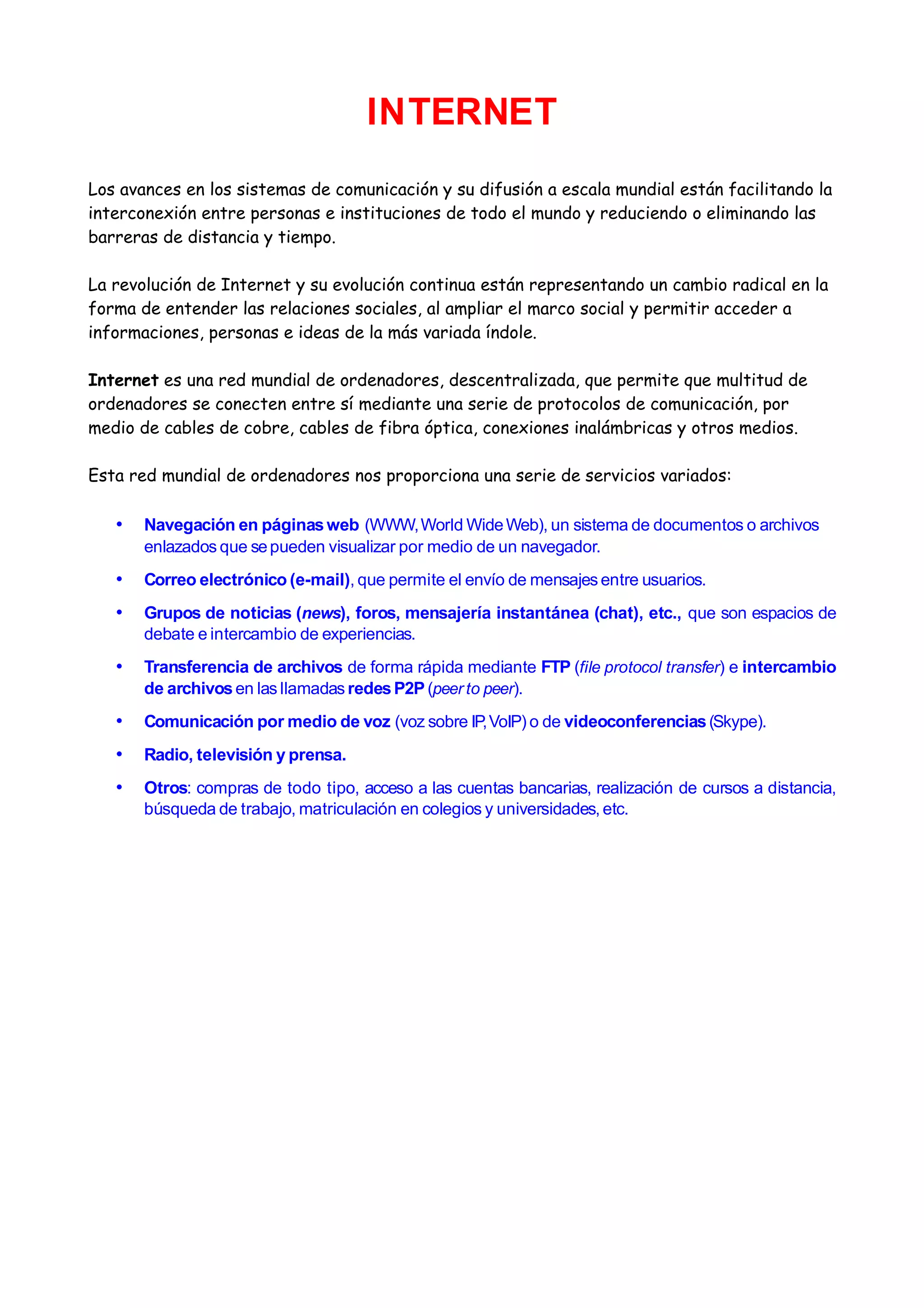 Internet ha facilitado la conexión global entre personas e instituciones al reducir las barreras de distancia y tiempo. Esta red mundial descentralizada de ordenadores conectados permite el acceso a una variedad de servicios como la navegación web, correo electrónico, transferencia de archivos, comunicaciones de voz y video, radio, televisión y prensa.