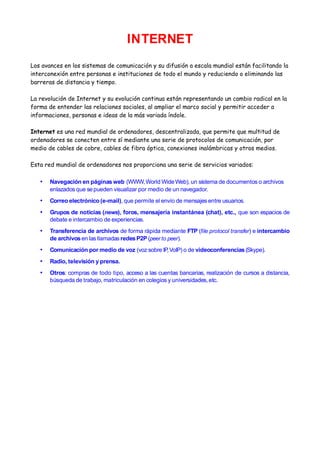 Internet es una red mundial descentralizada que conecta ordenadores de todo el mundo a través de protocolos de comunicación sobre cables y conexiones inalámbricas. Esta red proporciona servicios como navegación web, correo electrónico, grupos de noticias, transferencia de archivos, comunicaciones de voz y video, y acceso a contenidos de radio, televisión y prensa. Internet ha facilitado la interconexión global entre personas e instituciones, reduciendo las barreras de distancia y tiempo.