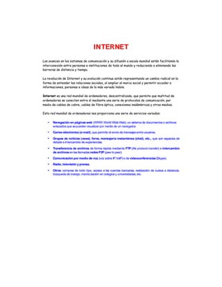 Internet es una red mundial descentralizada que permite la conexión de ordenadores a través de protocolos de comunicación por cables, fibra óptica u otras conexiones inalámbricas. Esta red proporciona servicios como navegación web, correo electrónico, mensajería instantánea, transferencia de archivos, comunicación de voz y video, y acceso a noticias, compras, banca, educación y empleo.