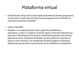 El documento describe la plataforma virtual del Bachillerato de la Universidad Autónoma de Sinaloa, la cual usa Moodle. Moodle permite a profesores crear cursos con recursos educativos y comunicarse con estudiantes. Los estudiantes pueden acceder a cursos matriculados y usar recursos como foros, chats y cuestionarios. La interfaz de los cursos incluye secciones, actividades y bloques laterales con herramientas como lista de participantes.