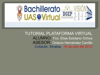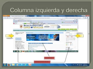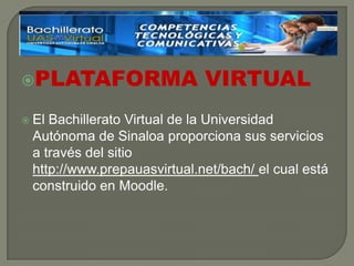 El documento proporciona información sobre la plataforma virtual del Bachillerato Virtual de la Universidad Autónoma de Sinaloa. Explica que la plataforma se encuentra en Moodle y se accede a través de un sitio web. También describe los elementos básicos de la interfaz como la cabecera, columnas y menús, y cómo acceder y navegar por los recursos y actividades del curso.