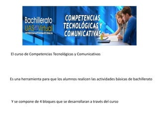 El documento describe la estructura y componentes de un curso en la plataforma Moodle. El curso se compone de 4 bloques con actividades previas, de desarrollo y de cierre. Cada bloque incluye instrucciones, consignas y rúbricas. La interfaz del curso contiene una cabecera, columnas central e izquierda/derecha y un pie de página. El estudiante opina que la plataforma y tecnología son una buena opción para el bachillerato virtual debido a su estructura y opcion