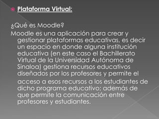 La plataforma Moodle es un sistema de gestión de cursos virtuales utilizado por el Bachillerato Virtual de la UAS. El documento describe la estructura e interfaz de Moodle, incluyendo acceso de usuarios, cursos, bloques, foros y otras herramientas. Los cursos en el Bachillerato Virtual están organizados en bloques semanales con actividades previas, de desarrollo y de cierre para evaluar el aprendizaje de los estudiantes a lo largo de cada mes de estudios.