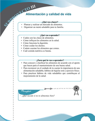Este documento trata sobre un proyecto relacionado con la alimentación y la calidad de vida. El proyecto incluye planear y realizar un mercado de alimentos y organizar un menú saludable para la familia. A través de diversas actividades, los estudiantes aprenderán sobre los diferentes tipos de alimentos, cómo influyen en la salud, el funcionamiento de la digestión y más. El objetivo es reconocer la importancia de una alimentación balanceada para el cuidado del cuerpo.