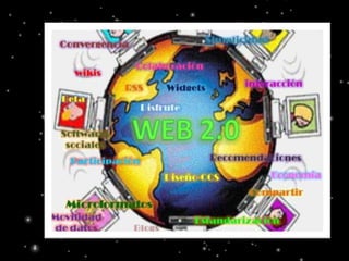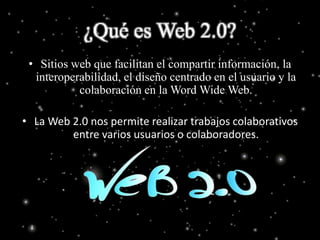 La Web 2.0 se refiere a sitios web que facilitan el compartir información y la colaboración entre usuarios. Se caracteriza por permitir que los usuarios contribuyan activamente a través de blogs, redes sociales, contenido agregado por usuarios y etiquetado colectivo. Incluye herramientas colaborativas y sociales como sistemas para lograr objetivos y compartir logros de forma conjunta.