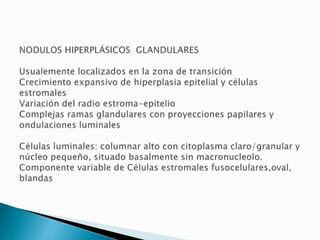 El documento describe una dilatación anormal de la pelvis y los cálices renales, junto con un adelgazamiento del parénquima renal, lo que sugiere una obstrucción del flujo de orina.