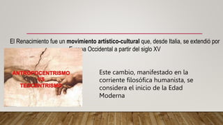 El Renacimiento se originó en Italia en el siglo XV y se extendió por Europa Occidental. Representó un cambio de paradigma con el resurgimiento del pensamiento humanista, centrado en el individuo. El arte renacentista buscó representar de manera naturalista e idealista el mundo real. El Renacimiento también trajo consigo importantes desarrollos científicos, el surgimiento de la burguesía, la consolidación de las universidades y la invención de la imprenta. Estos cambios marcaron el inicio de la Edad Moderna.