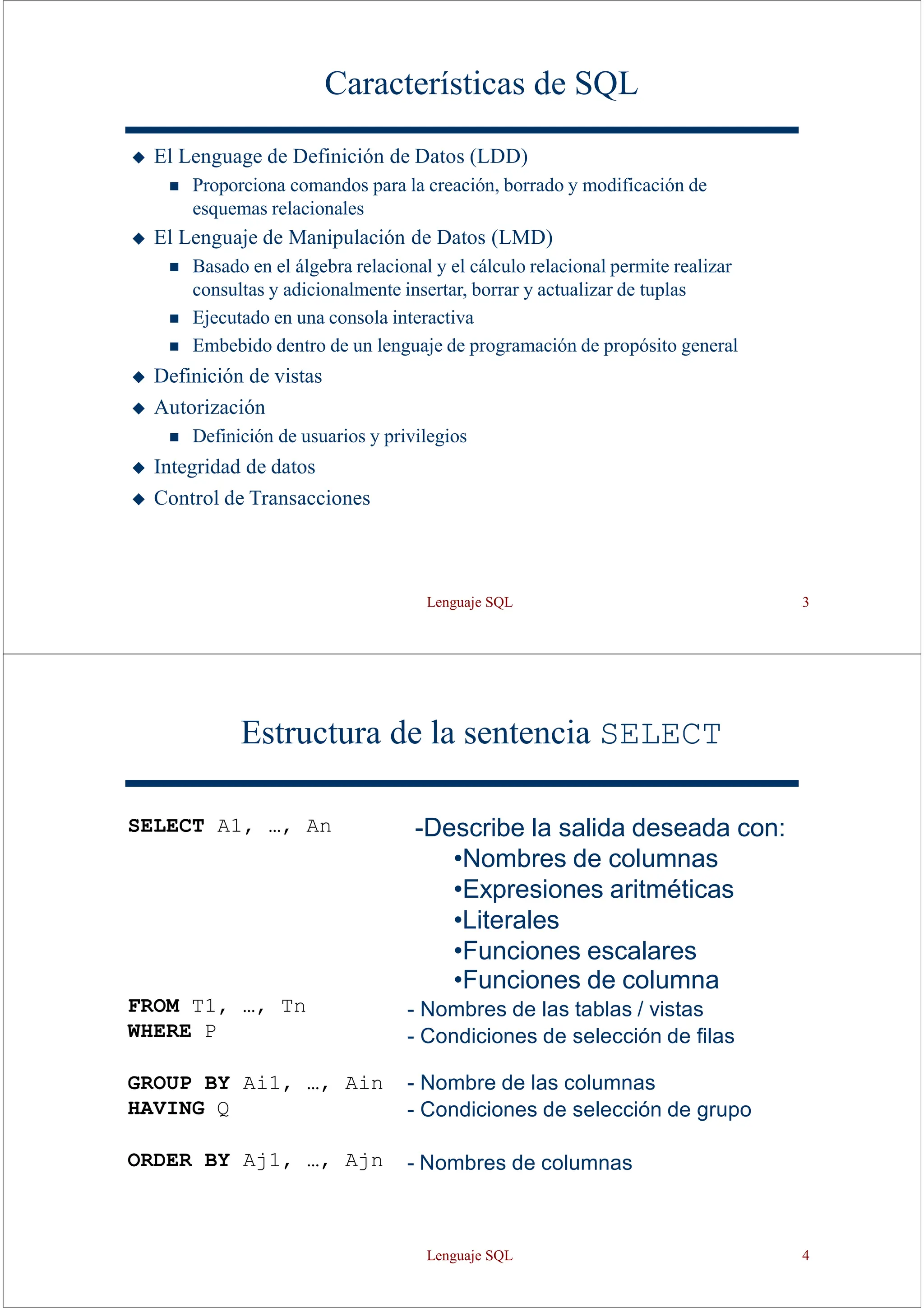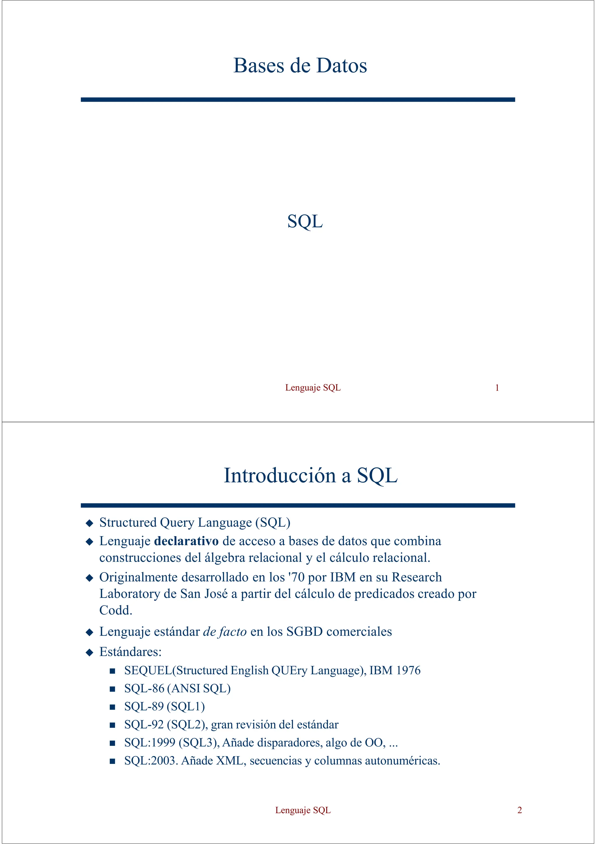 El documento presenta una introducción al lenguaje SQL, describiendo su propósito como un lenguaje declarativo para operar sobre bases de datos, así como su evolución y los estándares adoptados. Detalla las características más relevantes del SQL, incluyendo las cláusulas básicas como SELECT, FROM y WHERE, y cómo se realizan consultas, manipulaciones y filtrado de datos. Además, se exponen conceptos como ordenamiento de resultados, eliminación de duplicados y uso de funciones, junto con ejemplos prácticos.