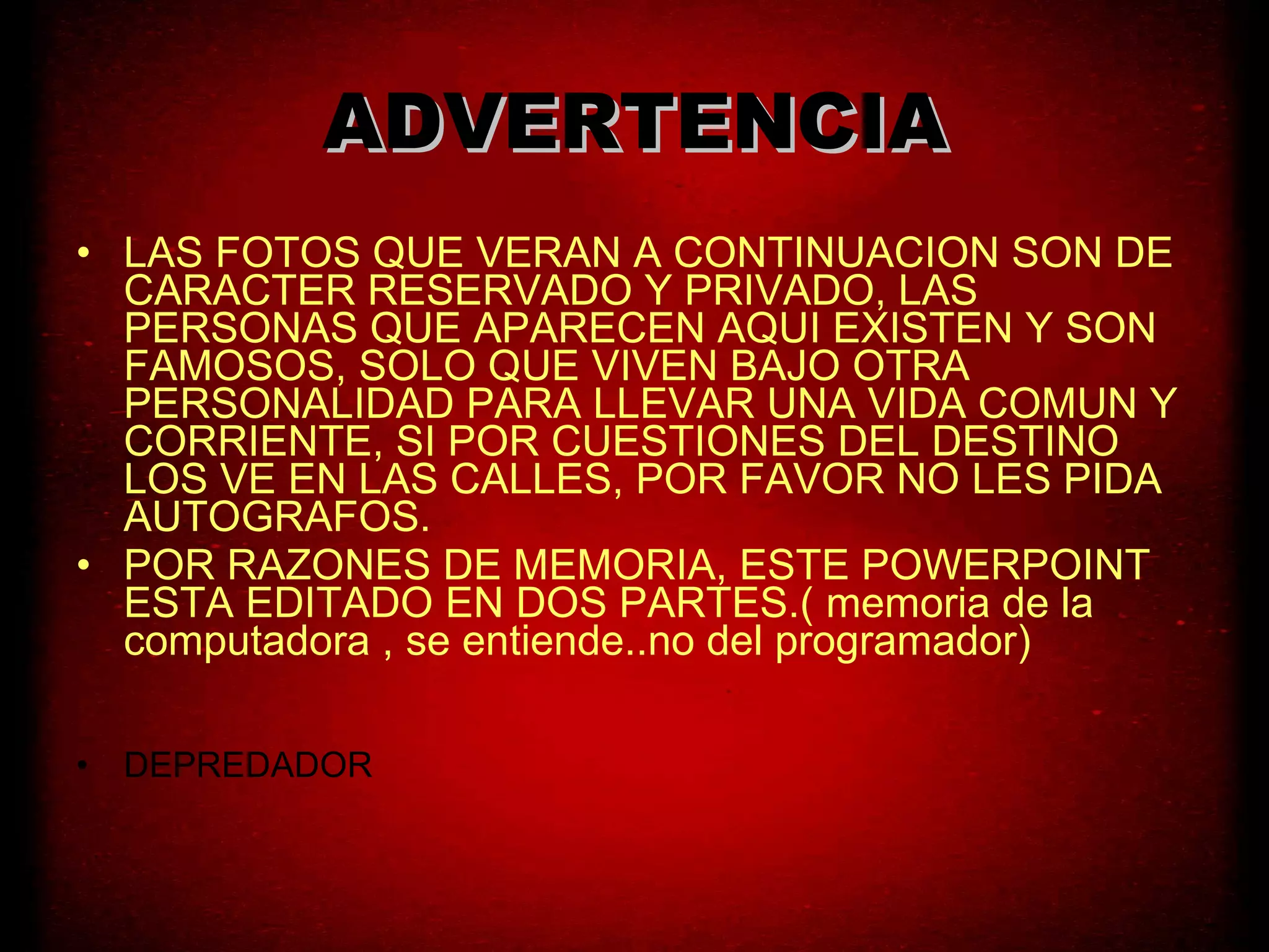 El documento advierte que las fotos que se mostrarán son de carácter privado de personas famosas que viven bajo otra identidad para llevar una vida normal. Se muestran fotos de tres famosos actores reconocidos por su atractivo físico, aunque uno de ellos suele usar disfraces de películas de terror y otro tiene mal carácter excepto los fines de semana.