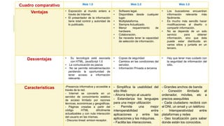 El documento compara las características de la Web 1.0, Web 2.0 y Web 3.0, incluyendo sus ventajas y desventajas. La Web 1.0 se caracteriza por ser estática y de solo sentido, mientras que la Web 2.0 permite más interacción e intercambio de información. La Web 3.0 pretende simplificar el uso de la web y estandarizar los lenguajes para mejor interoperabilidad entre aplicaciones y dispositivos.