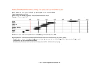 El resumen presenta los resultados de una encuesta realizada por Ipsos el 22 de noviembre de 2013 con 1052 participantes. Muestra que el N-VA obtuvo el 31,2% de apoyo, seguido por el CD&V con el 17,4% y el Open Vld con el 14,4%. También incluye los rangos de confianza del 80%, 90%, 95% y 99% para cada partido. Explica que los rangos de confianza pueden no ser aplicables debido a que la encuesta se realizó en línea y los resultados se ponderaron.