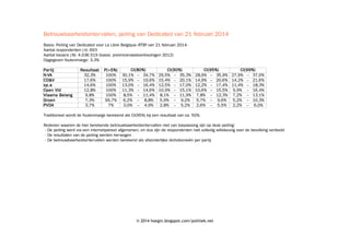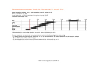 Este documento presenta los resultados de una encuesta realizada por Dedicated el 21 de febrero de 2014 en Bélgica. Muestra los porcentajes de intención de voto para los principales partidos políticos flamencos con sus respectivos márgenes de error.