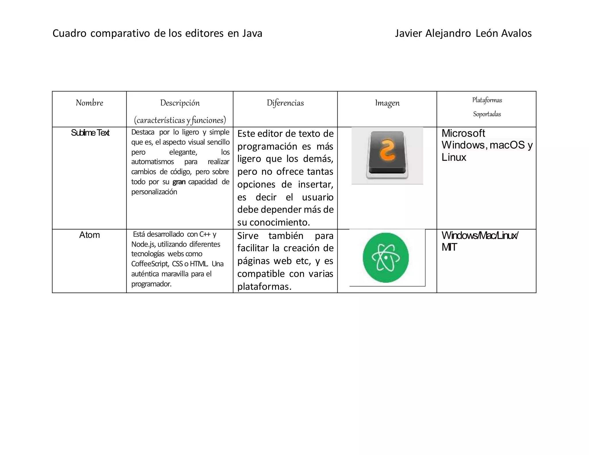 Este documento presenta un cuadro comparativo de los editores de código más populares para Java, describiendo las características y funciones principales de cada uno, sus diferencias, plataformas compatibles e imágenes. Los editores discutidos incluyen Sublime Text, Atom, Adobe Brackets, LightTable, VIM, Eclipse, NetBeans, IntelliJ IDEA, Visual Studio Express, Aptana Studio, FlashDevelop, Geany, Notepad++, TextMate, PSPad, gEdit y más.