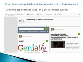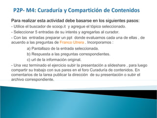 El documento proporciona instrucciones para una actividad de curaduría y compartición de contenidos en la que los estudiantes deben: 1) agregar un tema seleccionado a Scoop.it, 2) seleccionar 5 entradas y agregarlas al curador, 3) preparar una presentación evaluando cada entrada según las preguntas de Franco Utrera, y 4) compartir la presentación en el foro.