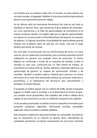 Este documento propone un proyecto para construir una red ferroviaria de norte a sur en Argentina, con el objetivo de descentralizar la economía y fomentar el desarrollo del interior del país. El proyecto usaría materiales reciclados y crearía puestos de trabajo. Las paradas incluirían terminales para promover productos regionales y el turismo. Se financiaría con un sistema de pago similar a SUBE y coordinaría con unidades penitenciarias para ofrecer oportunidades laborales.