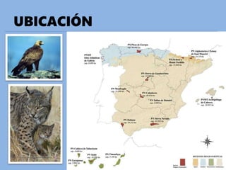 El documento presenta la Red de Parques Nacionales de España, que protege espacios de interés ecológico con alta singularidad de flora, fauna y geología. Describe 15 parques nacionales, incluyendo sus valores ecológicos, superficie total protegida terrestre y marina, que en total suman más de 1,5 millones de hectáreas.