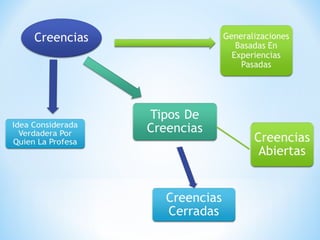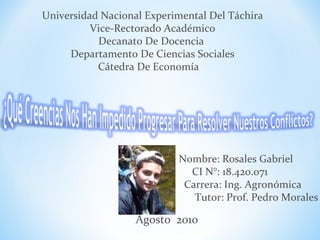 El documento trata sobre las creencias que han impedido el progreso de Venezuela para resolver sus conflictos. Define conflicto y explica el significado de la frase "sembrar petróleo" de Arturo Uslar Pietri, refiriéndose a una economía destructiva que depende del petróleo en lugar de invertir en agricultura. Identifica los conflictos de intereses entre productores y comerciantes, así como las malas políticas del gobierno en el sector agrícola y la falta de insumos, como factores que han impedido el progreso. Con