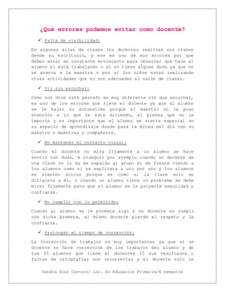 Este documento describe varios errores comunes que los docentes pueden cometer, incluyendo falta de visibilidad en el aula, no escuchar activamente a los estudiantes, no mantener contacto visual, no cumplir con las promesas hechas a los estudiantes, demorar la corrección de trabajos, usar un lenguaje que los estudiantes no comprendan, dejar que su estado de ánimo afecte la enseñanza, enfocarse solo en la enseñanza sin educar, y mezclar lo profesional con lo privado en las redes social