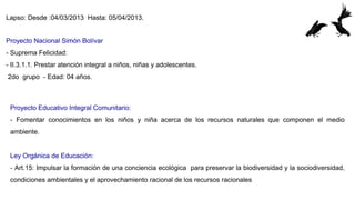El documento describe las actividades realizadas por un grupo de niños en una escuela de Venezuela enfocadas en aprender sobre los recursos naturales. Los niños muestran interés en conocer cómo nacen las plantas y sobre elementos de la naturaleza en sus dibujos. El documento también incluye la rutina diaria de la escuela, con énfasis en enseñar a los niños sobre el medio ambiente a través de canciones, cuentos, juegos y actividades prácticas.