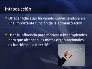 La dirección implica influir en los individuos para que contribuyan a las metas organizacionales a través del liderazgo y la comunicación. Es una función ejecutiva que guía a los subordinados y establece la cultura y valores de una organización para motivar el desempeño excelente.