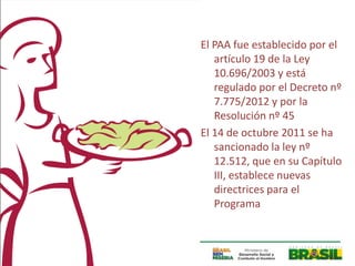 El Programa de Adquisición de Alimentos (PAA), establecido por la ley 10.696/2003, busca promover el derecho a una alimentación adecuada y fortalecer la agricultura familiar mediante la compra y distribución de alimentos a poblaciones en situación de inseguridad alimentaria. Desde su creación, el PAA ha evolucionado mediante formalizaciones de acuerdos con gobiernos estatales y municipales, facilitando la participación de agricultores familiares como proveedores y priorizando el abastecimiento de comunidades vulnerables. Entre sus objetivos, el programa también se integra al Plan Brasil Sin Miseria para erradicar la pobreza extrema mediante políticas de inclusión productiva.