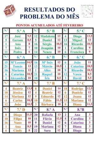 Este documento presenta los resultados acumulados de puntos de varios estudiantes hasta febrero en diferentes clases del 5o al 8o grado. Los estudiantes están ordenados de acuerdo con su número total de puntos en cada clase.