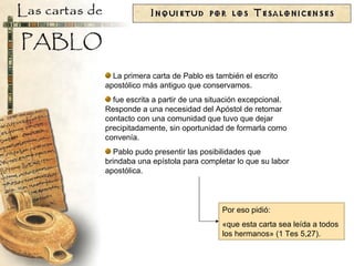 El documento describe la llegada de Pablo a Tesalónica después de haber sufrido persecuciones en Filipos. Pablo fundó una pequeña comunidad en Tesalónica compuesta principalmente por gentiles. Sin embargo, pronto enfrentó oposición de los judíos locales y de los macedonios pro-romanos debido a su predicación sobre Jesús como el verdadero Rey, lo que amenazaba el orden imperial. Esto forzó a Pablo a dejar precipitadamente Tesalónica, dejando a la nueva comunidad expuesta a la persecución.