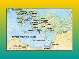 Este documento resume el tercer viaje misionero de San Pablo. Después de visitar Galacia y Frigia, Pablo llega a Éfeso donde encuentra discípulos de Juan Bautista y los bautiza en nombre de Jesús. Permanece dos años en Éfeso predicando en la sinagoga y en la Escuela de Tirano. Durante este tiempo escribe varias cartas a las comunidades que fundó. Finalmente, parte de Éfeso rumbo a Jerusalén con representantes de las comunidades para llevar las limosnas, a pesar de las advertencias