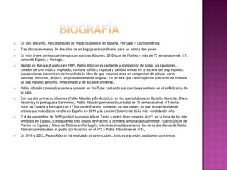 Pablo Alborán es un cantante y compositor español que ha tenido un gran impacto en España, Portugal y América Latina en solo dos años. Ha lanzado tres álbumes en este corto período de tiempo que han alcanzado 21 Discos de Platino y más de 75 semanas en el número uno en las listas de España y Portugal. Además de componer sus propias canciones, Pablo Alborán construye un pop español genuino y emocionante con una calidad única.