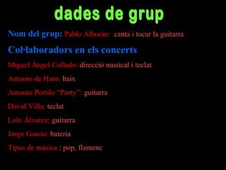 Este documento proporciona información sobre el cantante español Pablo Alborán. Resume que Pablo Alborán es un cantautor que canta pop y flamenco acompañado de una banda de músicos. Ha lanzado dos álbumes de estudio y ha realizado conciertos en Chile y México.