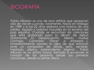 Pablo Alborán es un joven cantautor español nacido en 1989 en Málaga que compone música de alta calidad y solidez inusual en la escena pop española. A sus 22 años, las canciones que graba para su álbum debut muestran que es un compositor serio, sensible e inspirado llamado a conmover a la gente. En mayo y junio de 2011 dará conciertos en varias ciudades españolas.