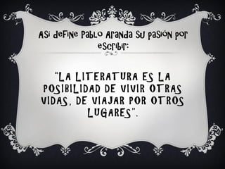 Pablo Aranda es un escritor malagueño que se ha dedicado a la literatura infantil después de escribir varias novelas para adultos. Su pasión es la literatura porque le permite vivir otras vidas y viajar a otros lugares. Su primera novela infantil, "Fede quiere ser pirata", ha tenido éxito y ganó un premio en Málaga en 2011. El libro mezcla humor y la vida cotidiana de una manera fantástica.