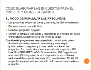 Este documento ofrece recomendaciones para formular preguntas en encuestas de investigación. Sugiere que las preguntas sean claras, precisas y contengan una sola idea, y que se eviten las preguntas dirigidas o con lenguaje vago. Explica que se pueden usar preguntas abiertas o cerradas, y da ejemplos de cada tipo, incluyendo preguntas dicotómicas, de selección múltiple y categorizadas.