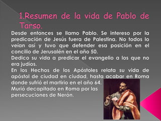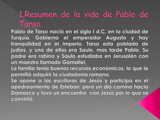 El documento describe varias obras de arte que representan la conversión de Pablo de Tarso del judaísmo al cristianismo, incluyendo su presencia en la ejecución de Esteban, y sus posteriores predicaciones y difusión del cristianismo tras su encuentro con Jesús.