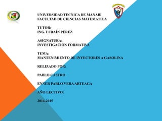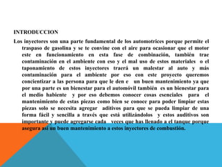 Este documento trata sobre el mantenimiento de inyectores a gasolina. Explica que los inyectores son piezas fundamentales en los automóviles ya que permiten el paso de gasolina al motor. Un mal mantenimiento o taponamiento de los inyectores puede causar problemas mecánicos y contaminación. Luego describe los distintos tipos de inyectores y formas de limpiarlos, incluyendo el uso de aditivos, limpieza manual o profesional con ultrasonido. El objetivo es concientizar sobre la importancia de mantener los inyectores en buen estado