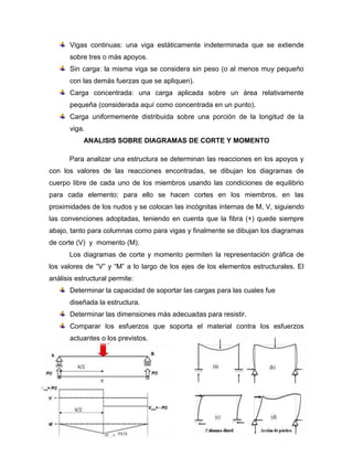 Este documento describe los diagramas de fuerza cortante y momento flexionante para vigas. Explica que estos diagramas muestran cómo varían la fuerza cortante y el momento a lo largo de la viga dependiendo de las cargas aplicadas. Ofrece dos métodos para trazar estos diagramas y describe que estos diagramas proporcionan información útil para el diseño de vigas al mostrar las zonas de mayor esfuerzo.