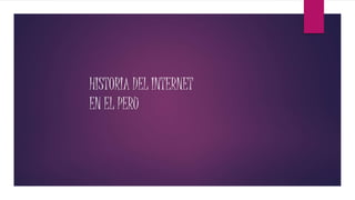 El internet llegó por primera vez al Perú en 1994 cuando la Red Científica Peruana instaló la primera cabina pública en el Centro Cultural Ricardo Palma con 40 computadoras para que las personas puedan acceder gratuitamente a internet. El objetivo principal era contribuir al desarrollo nacional, pero se enfrentó a problemas como la falta de infraestructura, cultura de internet y contenidos relevantes. Las primeras computadoras llegaron al Perú en 1971 y la conexión a internet se estableció en 1985 cuando la IBM financió la conexión de 5 universidades, aunque proyect