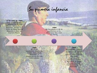 Pablo Neruda nació en 1904 en Parral, Chile con el nombre de Ricardo Eliecer Neftalí Reyes Basoalto. Tuvo una infancia marcada por la muerte de su madre y el matrimonio de su padre. Estudió en el Liceo de Hombres de Temuco y la Universidad de Chile, donde comenzó su carrera literaria publicando su primer libro Crepusculario en 1924. Más tarde ocupó cargos diplomáticos en España, México, Francia y otros países, y fue nombrado cónsul y senador,