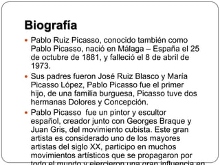 Pablo Picasso fue un pintor y escultor español nacido en 1881 en Málaga. Fue uno de los artistas más importantes del siglo XX y participó en varios movimientos artísticos como el cubismo. Algunas de sus obras más conocidas incluyen "El Entierro de Casagemas", en honor a su amigo fallecido, y "La familia de Saltimbanquis", que representa figuras estilizadas de titiriteros.