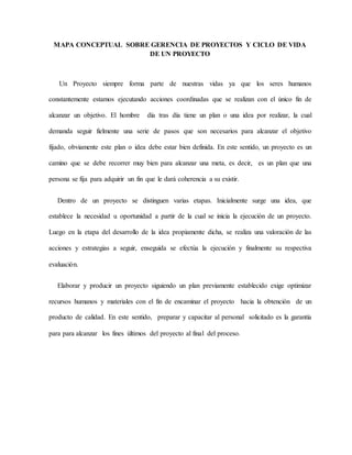 El documento describe la gerencia de proyectos y el ciclo de vida de un proyecto. Explica que un proyecto sigue varias etapas como la idea inicial, el desarrollo de la idea, la ejecución y la evaluación. También detalla los elementos necesarios en el ciclo de vida de un proyecto como las etapas, los responsables clave y el rol de un profesional. Finalmente, concluye que la planeación estratégica es clave para definir los objetivos y estrategias de un proyecto que permitan incrementar las posibilidades