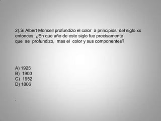 El documento presenta 3 preguntas sobre la historia del estudio del color. La primera pregunta se refiere a Isaac Newton como el primer científico en investigar el color y descubrir los colores complementarios. La segunda pregunta indica que Albert Moncell profundizó el estudio del color a principios del siglo XX, específicamente en 1900. La tercera pregunta menciona que Polt tomó la teoría de Albert Moncell pero propuso que los colores complementarios son el amarillo, azul y rojo.