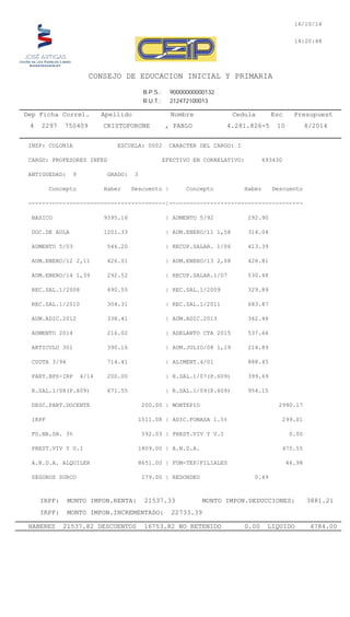 Este documento contiene los detalles de la liquidación de sueldo de Pablo Cristoforone, un maestro con 9 años de antigüedad. Incluye los haberes, descuentos y liquido final para los meses de octubre de 2014 en dos escuelas diferentes. Los haberes incluyen el sueldo básico, aumentos por antigüedad, docencia, entre otros. Los descuentos son por conceptos como aportes jubilatorios, impuestos y cuotas sindicales. El liquido final para la primera escuela fue de $4784 y para